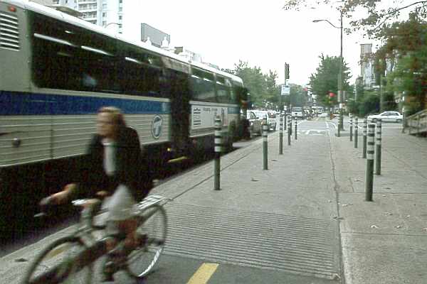 Bus stop with sidepath on sidewalk. Passengers waiting for the bus or getting on and off must contend with bicyclists crossing on the sidewalk. Note handlebar-snagging posts -- bicycle handlebars overhang the wheels and so these posts effectively narrow the two-way bike route by four feet, to only a single safe line of travel including very modest shy distance. In the photo, every second post has been removed after only a year or so after the Axe Nord-Sud opened. I suspect that they were removed in an attempt to decrease the hazard. Posts immediately adjacent to a bikeway are not acceptable under US bicycle facilities design guidelines. Also, straying into one of the curbs immediately adjacent to the bicycle route will topple a bicyclist. The curb directly behind the bicyclist in the picture would topple the bicyclist into the street.