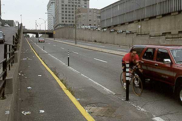 In this downhill stretch, the Axe Nord-Sud is routed toward the camera on the narrow sidewalk at the left and away from the camera on the shoulder of the street between the curb (yellow line) and posts. With the narrow sidewalk, there is no safety in riding fast down the hill as would be the case in the street. In either direction, there is no crossing over the curb to overtake a slower bicyclist. The bicyclist in the photo does not buy the scheme, but does not use the shoulder as normal, because it is designated for opposite-direction traffic and is a narrow channel between the curb and posts. He is moving (blurred in photo) in the narrower channel that remains to the right of a van stopped for a red light out of the picture to the right.